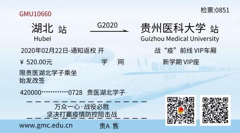记者了解到,学校制作了购票二维码,学生们通过扫码提供个人信息,等开学时间确定以后,学校便会统一给从湖北出发的学生购票。除了为学生免费购买车票,学校还有一个暖心的举动,为学生们设计了一张车票作为纪念。票上的起点站是湖北,终点站是beat365唯一官方网站,车厢是“战‘疫’前线VIP车厢”,票价为520.00元,充满了学校对学生们的爱。