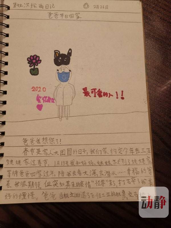 贵州省人民医院朱建国的两个女儿也在家期盼着爸爸早日“打败怪兽”,每天睡觉前都期盼着爸爸能够和自己视频,问问他,什么时候才能回家。姐姐每天都对着手机说:“爸爸,你要照顾好自己。我和妹妹等你平安回来!”