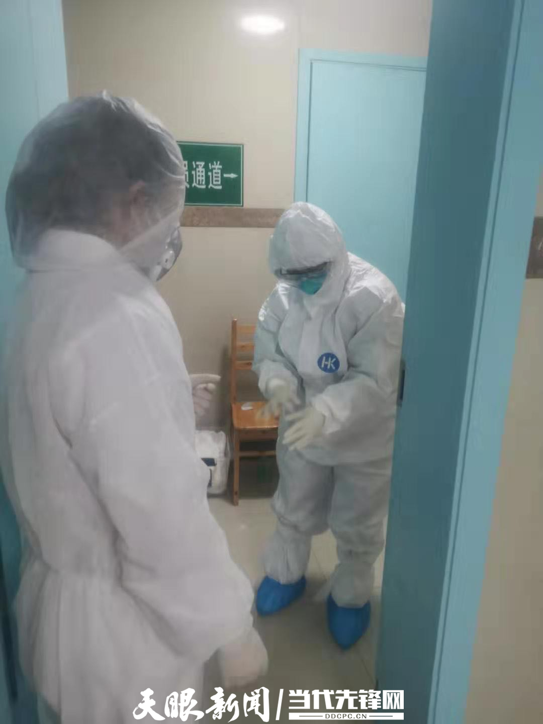 程玉梅(右)穿戴好防护装备进入隔离病房