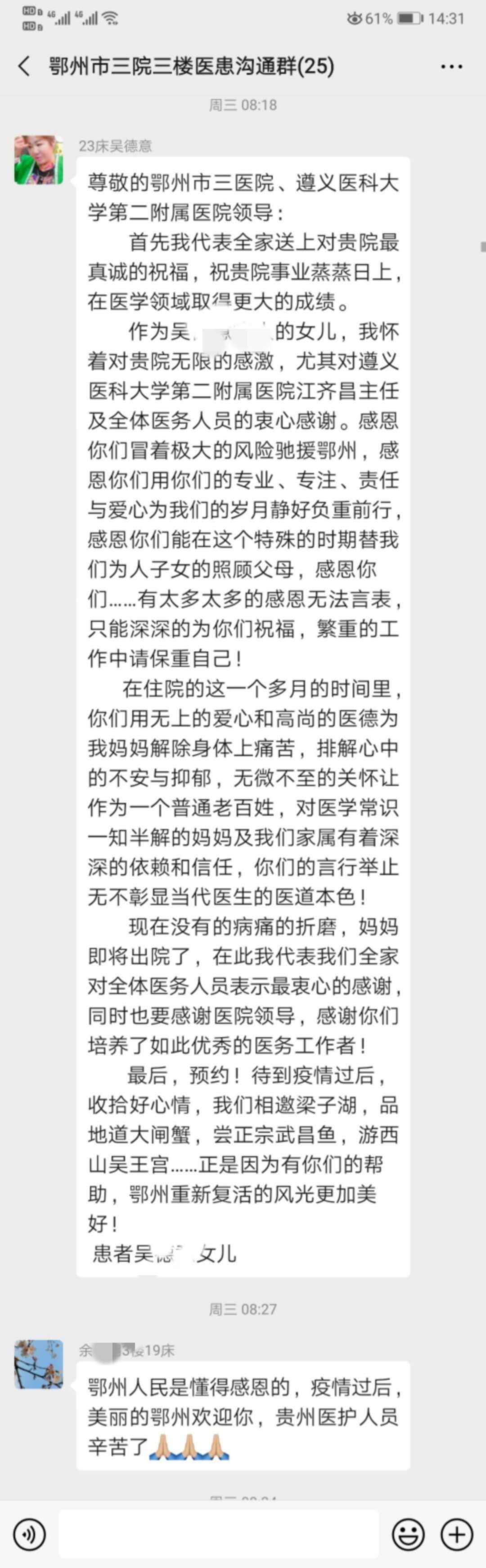 离开原来的病房,不止鄂州战友舍不得,就连患者也是泪水涟涟,30多封感谢信从4家医院飞来,万语千言,汇成四个字:感恩,致敬。