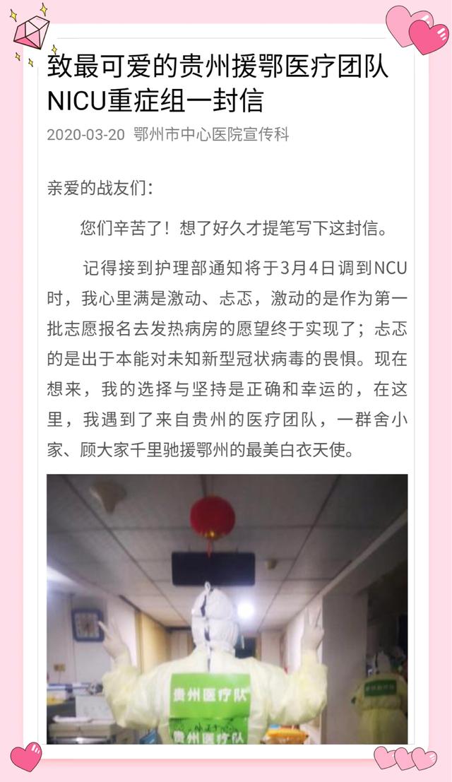 “今天,我看到鄂州市中心医院护士写给贵州援鄂医疗队重症组的一封感谢信,很有感触。在疫情防控阻击战中,我们与鄂州医护相遇,一起并肩战斗,这是一种缘分和友谊,更是彼此之间的信任与责任。”