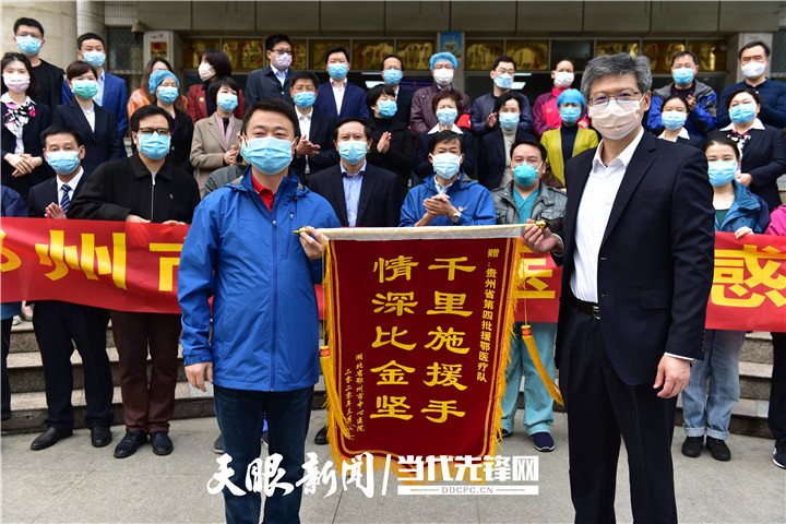 中心医院刘黎明院长和其团队为贵州医疗队送来两面锦旗,感谢43天以来,贵州省第四批、第六批援鄂医疗队的艰辛付出。刘黎明院长怀着深切地感情,感谢贵州医疗队,也希望将来能与贵州有医疗方面的合作。