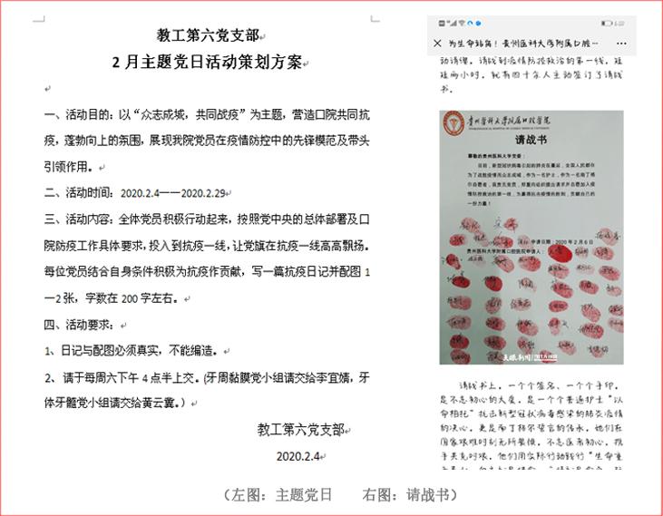 为充分发挥基层党组织在疫情防控工作中的战斗堡垒作用,打好疫情防控阻击战,教工第六党支部紧密结合疫情防控工作开展主题党日活动,2月份以“众志成城,共同战疫”为主题,开展主题党日活动,号召全体党员积极行动起来,按照党中央的总体部署及口院防疫工作具体要求,投入到抗疫一线,让党旗在抗疫一线高高飘扬。支部全体党员积极行动起来,带头参加医院值班,导诊,急诊,预检分诊等各项防控工作,蔡扬多次参加附属医院感染科新冠肺炎患者的全院会诊,为新冠肺炎患者的口腔疾病提出专业诊疗方案,并与药剂科主任陈萍一起代表附属口腔医院为新冠肺炎病人捐赠口腔治疗专用药物,党员护士主动写下请战书要求支援武汉抗疫一线;支部全体党员响应院党委号召自愿捐款支持疫情防控。同时,支部不忘关心贫困学生就业的帮扶工作,党员罗亮作为本支部指定贫困学生帮扶联络人,密切与帮扶对象进行了解沟通,定时了解其思想动态及困难,积极为贫困学生存在问题进行疏通排难。按照省教育厅“停课不停学”的总体部署,党员教师不忘教书育人职责,积极采取各种线上教学方式为本科生开展多种形式的网上教学活动。