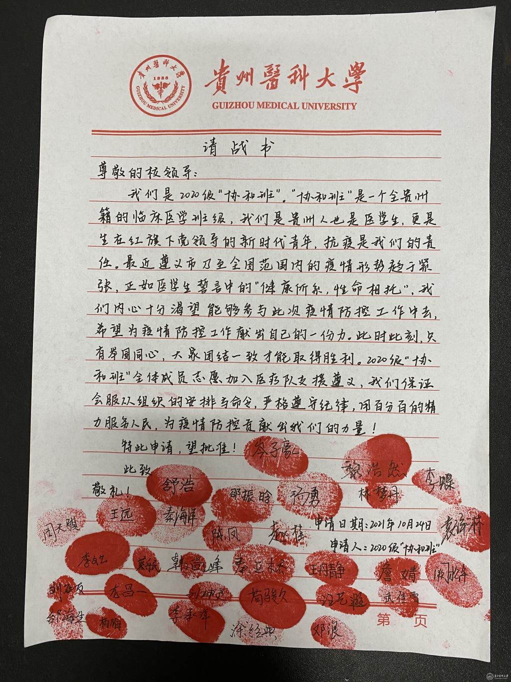 本轮疫情突袭遵义,抗疫一线时刻牵动着贵医学子的心。“协和班”2019级、2020级的全体同学在第一时间向校党委递交了请战书,并表达了为家乡抗疫贡献自己力量的迫切愿望。
