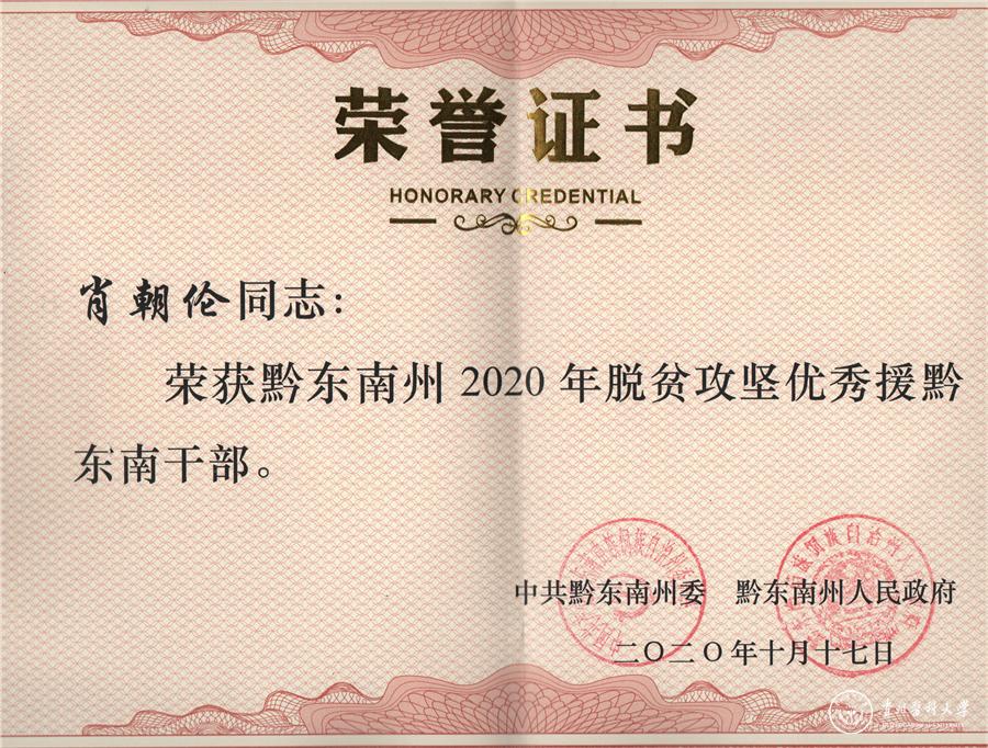 在第七个国家扶贫日到来之际,黔东南州委州政府表彰了在全州2020年脱贫攻坚工作中做出突出贡献的先进个人,beat365驻村帮扶队员:运动与健康学院孟立科、保卫处李金臣、药学院杨翀、基础医学院肖朝伦、第二附属医院崔望川等五位同志荣获“黔东南州2020年脱贫攻坚优秀援黔东南干部”称号。