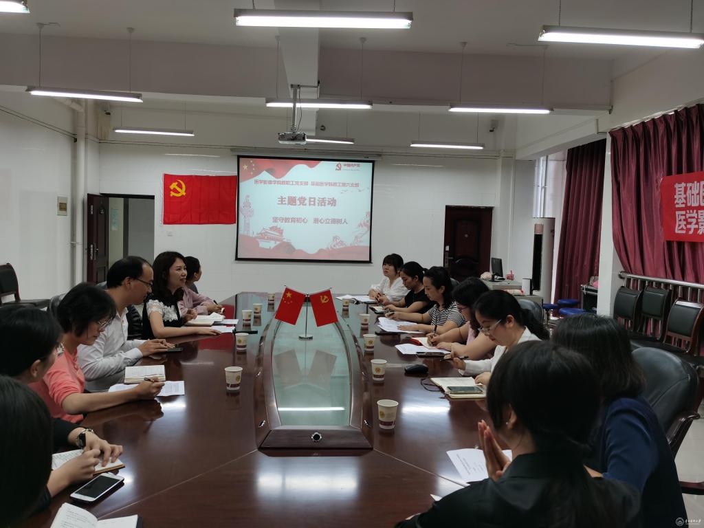全体党员集中学习习近平总书记第三十六个教师节重要寄语、《习近平总书记关于教育的重要论述》以及《关于加强和改进新时代师德师风建设的意见》等精神,进一步提高思想认识,自觉增强立德树人、教书育人的荣誉感和责任感。基础医学院第六党支部书记洪艳带领全体党员重温了入党誓词,面对党旗庄严宣誓,重温自己对党忠诚的誓言。随后,与会同志以“坚守教育初心,潜心立德树人”为话题展开热烈讨论:谢弘回顾了逆行抗疫的经历,认为自己不仅是医生,还是教师,要为国家培养胸怀天下、心系生命的医学人才,需要积极探索新时代教育教学方法,不断提升教书育人本领;洪艳认为大学的课堂不应单纯传授医学知识与讲解相关原理,更应成为人格养成、人性涵养的园地,作为新时代的教师,应将社会主义核心价值观融入到教书育人的全过程,努力落实课程思政的各项要求;李丹认为要树立“一切为了学生,为了一切学生”的理念,关照与服务学生,为学生的健康成长保驾护航。