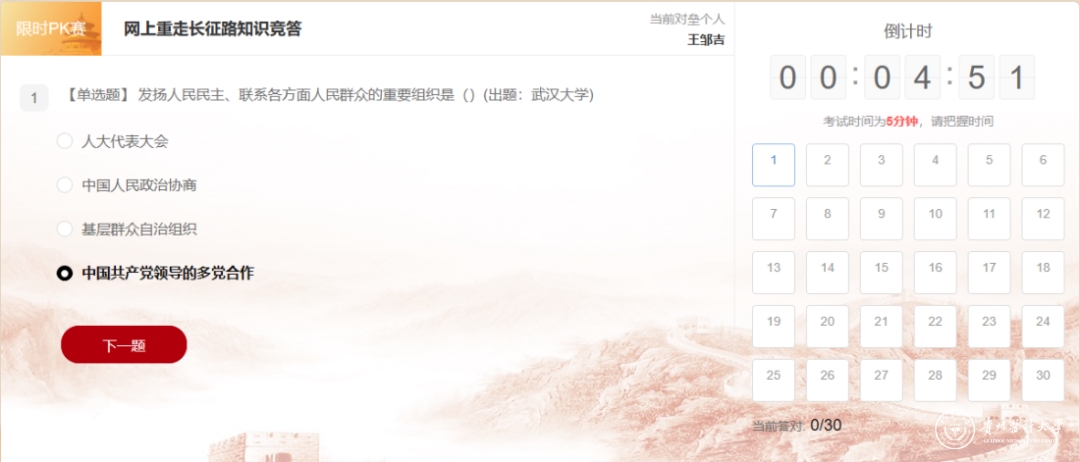 为深入学习贯彻习近平总书记关于学校党建和思政工作的重要指示批示精神,贯彻落实教育部、教育厅印发有关开展“网上重走长征路”暨推动“四史”学习教育的文件精神,现面向全校师生组织开展“网上重走长征路”暨推动“四史”学习教育竞答活动。