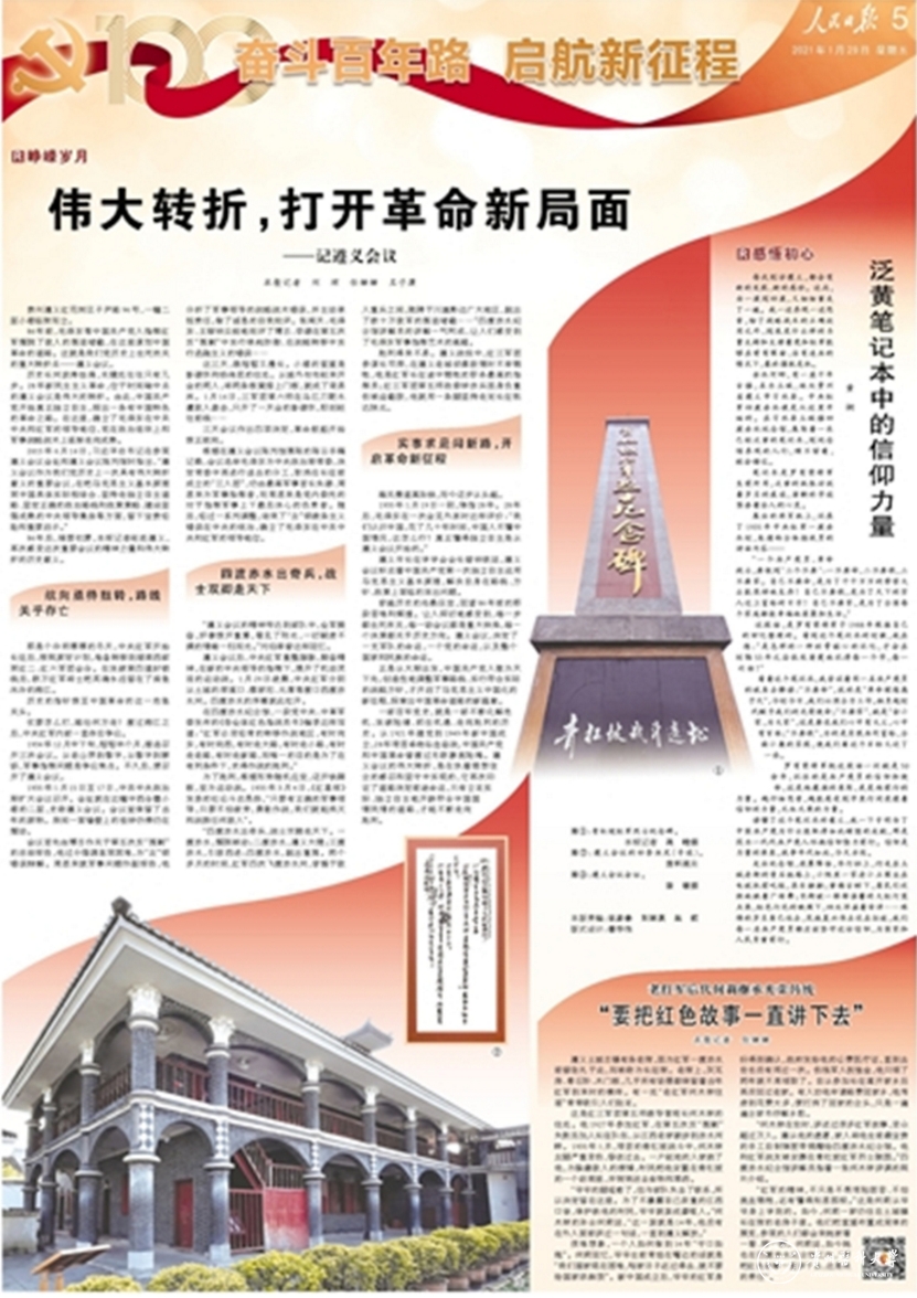 1月29日出版的《人民日报》,用两个整版刊发了“奋斗百年路 启航新征程”系列报道,通过对遵义会议会址、四渡赤水纪念馆、娄山关红军战斗遗址的走访,看历史文化名城遵义是如何将红色基因代代相传……