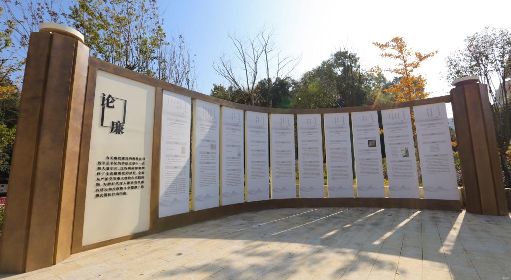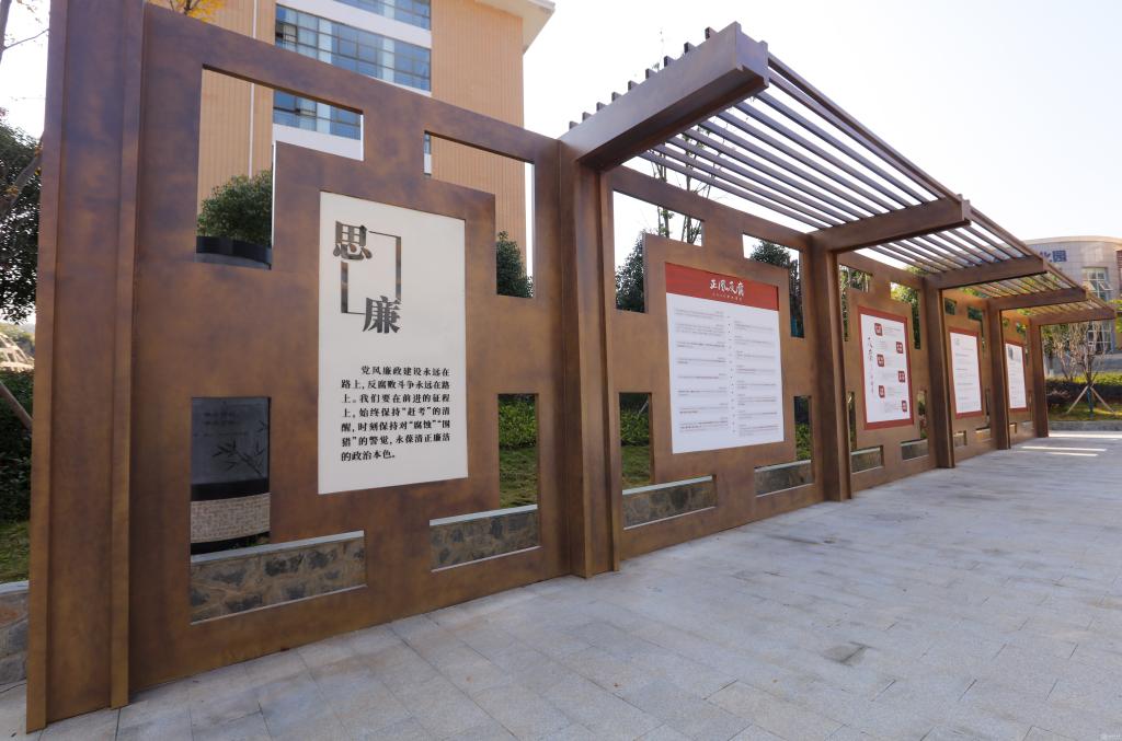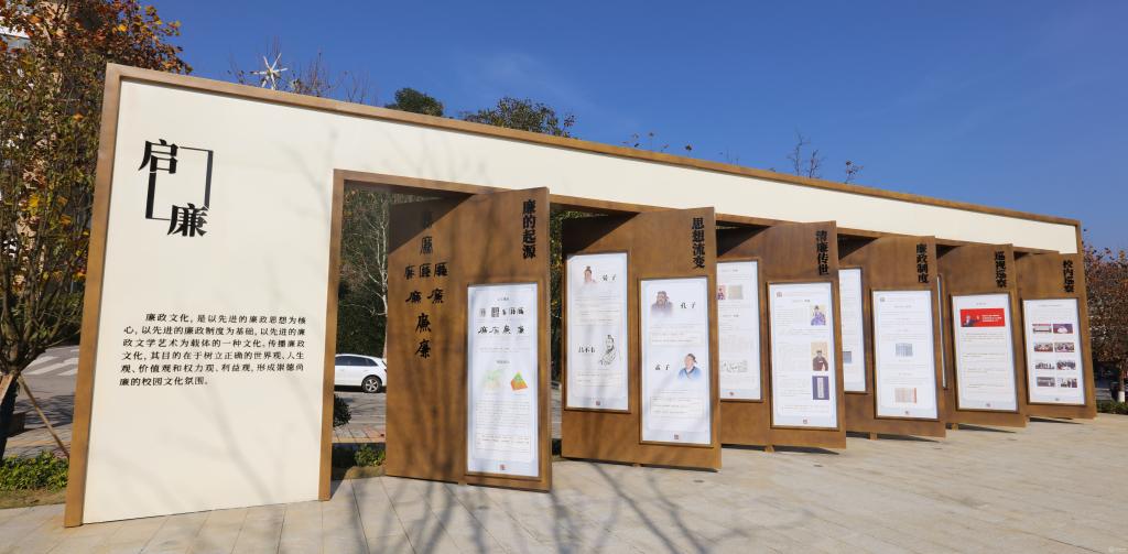 廉政文化广场位于南校区善思楼右侧,面积约1625平方米,以“无规矩不成方圆”为设计理念,以中轴对称为核心设计方向发散四周,动线以回字形为主动线进行布局,围绕“廉”字主题,廉政文化广场共分为清廉墙、启廉、论廉、思廉、修廉、五个部分。