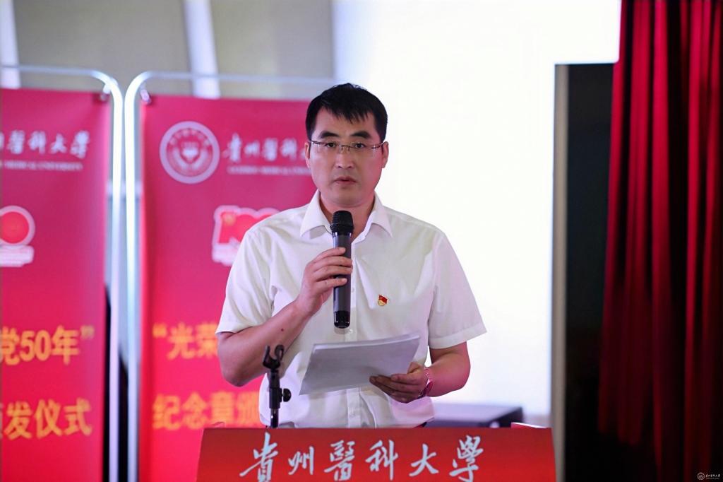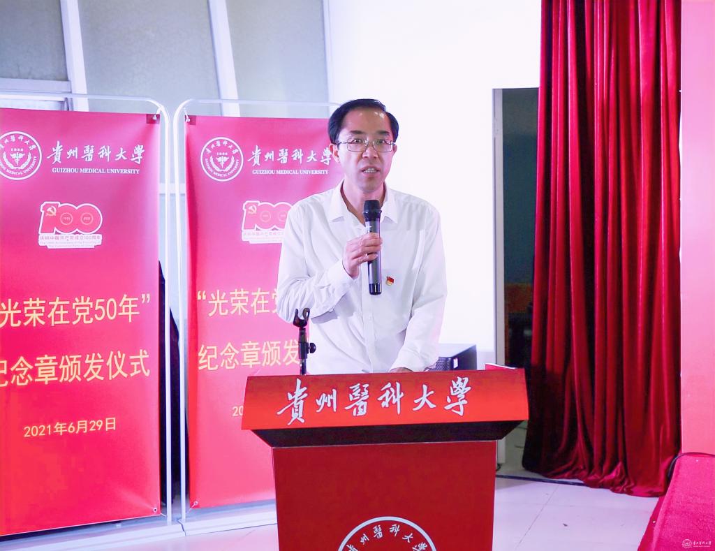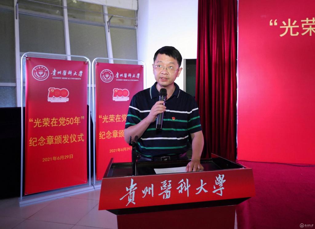 仪式由附属医院党委书记刘文主持。校党委副书记、校长罗鹏,校领导战勇、刘文、陈代勇、汤磊,学校各职能部门负责人、光荣在党50年的老党员、离退休工作处有关人员及学校部分学生新党员代表参加。