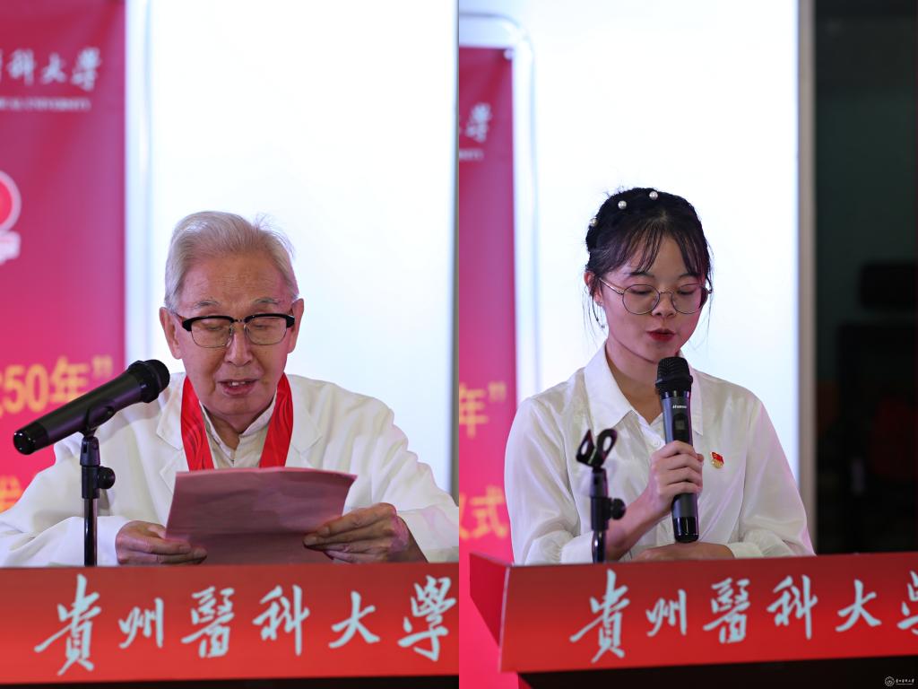 “光荣在党50年”纪念章获得者代表离休干部贺志光、新发展党员代表临床医学专业2018级学生杨斯分别作交流发言。