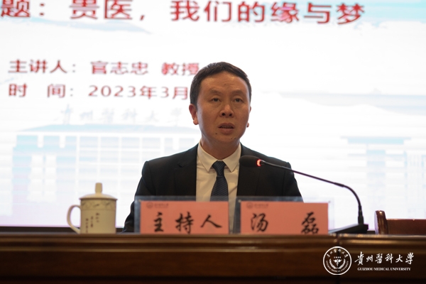 汤磊在主持时指出,一个大学之所以成为大学,并不在于它有多少幢大楼,而在于它有多少名大师。学校之所以有现在的发展,离不开一代代贵医人的付出和心血。广大青年学生要以官志忠教授等老一辈贵医人为学习榜样,汲取榜样力量,锤炼品德修为,涵养高尚情操,矢志追求更有高度、更有境界、更有品位的人生;要发扬科学精神,勇于创新创业,努力在医学教育以及医疗卫生领域干出一番事业,做有科教水平和文化涵养的贵医人,为实现中国梦而努力奋斗。
