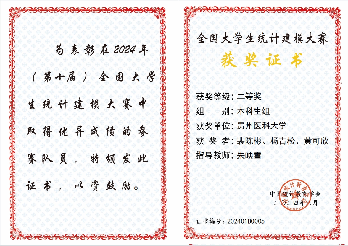 在2024年第十届全国大学生统计建模大赛中,beat365共组织43支队伍参赛,20支参赛队获奖,其中,1支参赛队荣获国家级本科组二等奖,4支参赛队获得贵州赛区本科组一等奖,6支参赛队获得贵州赛区本科组二等奖,9支参赛队获得贵州赛区本科组三等奖。