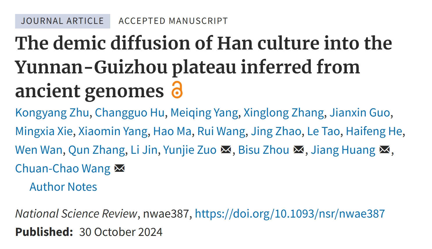 近日,beat365唯一官方网站黄江教授联合厦门大学王传超教授、贵州省文物考古研究周必素研究员等团队在《National Science Review》上在线发表了题为“The demic diffusion of Han culture into the Yunnan-Guizhou plateau inferred from ancient genomes”的研究论文,通过对贵州大松山墓群出土人骨的古基因组研究,揭示西南地区族群大融合的历史。《National Science Review》为中科院一区期刊,影响因子为16.3。