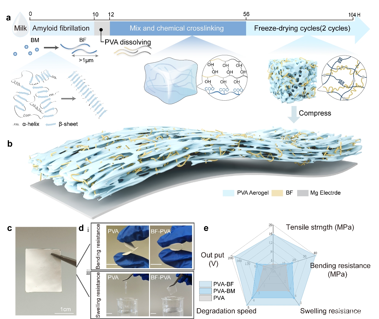 可降解摩擦纳米发电机(TENG)作为自供电传感器和可降解能源在瞬态医疗设备中具有巨大潜力。然而,传统的可降解材料往往存在机械韧性不足,易溶胀且接触起电性能较低的问题,限制了其实际应用效果。为了克服这些挑战,研究团队采用了一种生物大分子辅助增强策略,将β-乳球蛋白纤维(BF)引入PVA气凝胶材料中。
