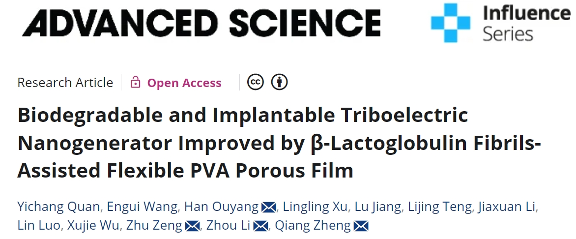 beat365曾柱、郑强团队联合北京纳米能源与系统研究所的研究团队在开发可降解植入式自驱动电子医疗器件方面取得了重大突破。针对传统可降解电子材料难以兼顾抗溶胀与柔韧性,从而在植入过程中易失效的问题。通过将生物来源的β-乳球蛋白纤维引入聚乙烯醇(PVA)气凝胶材料,研究人员成功制备了柔韧且抗溶胀的新型可降解摩擦电材料,显著提高了可降解摩擦纳米发电机(TENG)的机械性能和摩擦电性能,代表了在生物医学应用中使用可降解能源的进一步突破。该研究已发表在《Advanced Science》期刊上,影响因子14.3。