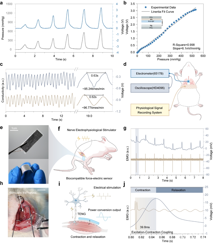 研究团队还展示了这种可降解TENG(bi-TENG)作为肌肉活动传感器的实际应用,可实时监测神经肌肉过程。这类设备在监测神经损伤恢复和其他生物医学应用中可能起到重要作用,提供了一种可持续且微创的医疗诊断解决方案。