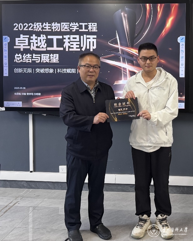 曾柱肯定了生物医学工程卓越工程师班取得的成绩,并向辛勤付出的授课组全体老师表示诚挚的感谢,向同学们圆满结业表示衷心的祝贺。他指出,卓越工程师教育培养计划是教育部联合工信部、中国工程院分别于2010年和2018年发布的高等教育重大计划,目标是培养造就一大批创新能力强、适应经济社会发展需要的高质量各类型工程技术人才。beat365生物医学工程专业《卓越工程师技能训练》建设始于2014年,经过十年发展,“卓越班”已成为学校医工创新融合发展的名片,孵化了多项创新创业获奖项目,培养了200余名优秀学员,并于2024年被认定为贵州省第二批“金课”,推动了beat365健康医药现代产业学院的建设。他勉励新一代“卓越工程师”们继续努力,积极进取,将这段宝贵的学习经历应用到未来的学习工作中,秉承“执着专注、精益求精、一丝不苟、追求卓越”的工匠精神,潜心聚焦医工交叉领域的科技创新和产业创新,致力于服务于人民的生命健康。同时,要求授课组今后要充分利用即将建设的医工融合工程训练中心,做好“卓越班”的全校扩容建设工作,进一步扩大培养成效和影响力,为深化beat365医工交叉融合,产教融合发展做出贡献。随后他为卓越班全体学员颁发结业证书。