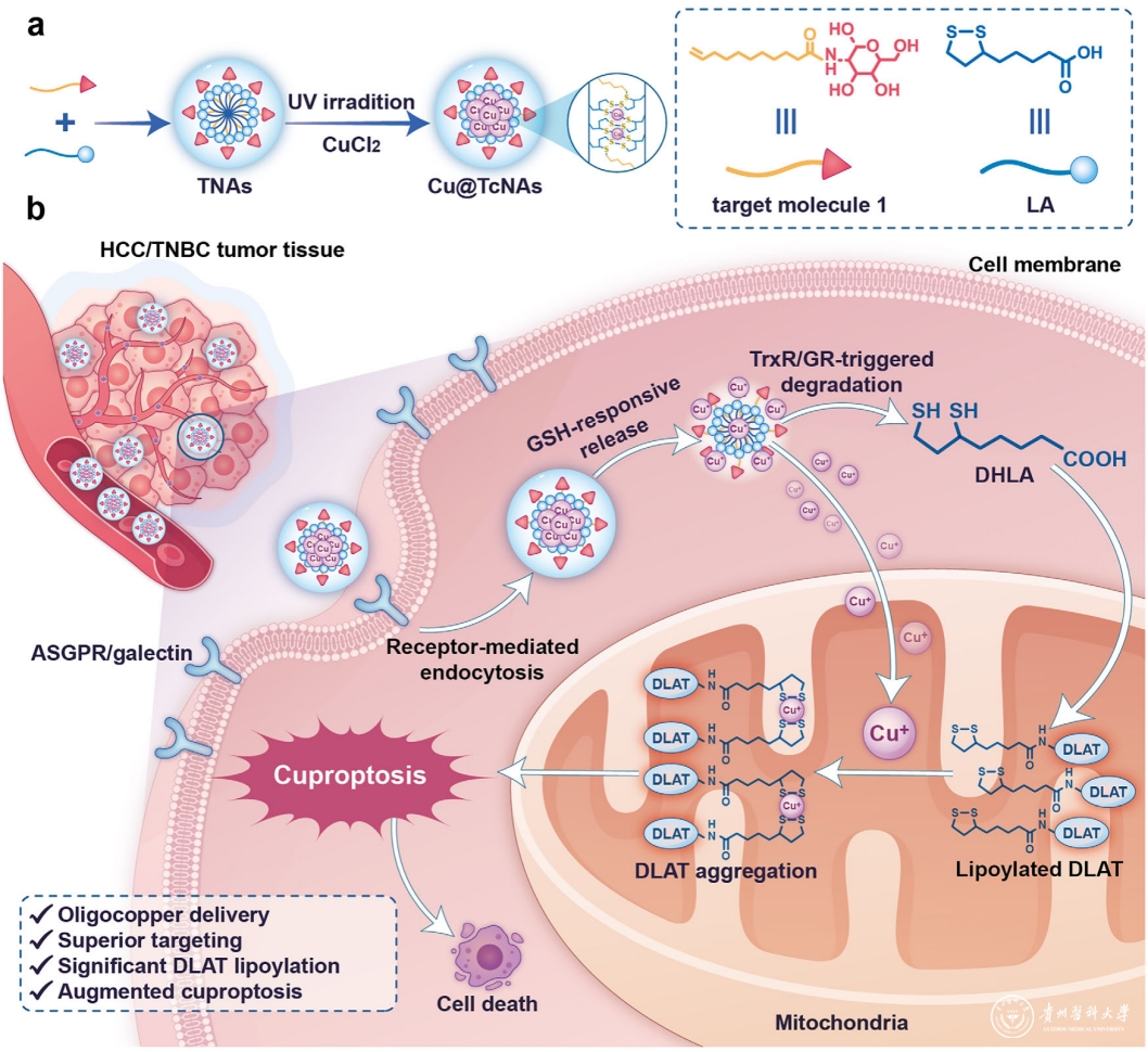 本研究制备的Cu@TcNAs通过将含有乙酰半乳糖胺靶向基团的十一碳-10-烯酸嵌入其中,展现出良好的生物相容性。Cu@TcNAs可通过受体介导的内吞作用进入肿瘤细胞,并表现出谷胱甘肽(GSH)响应性药物释放特性,从而有效提升线粒体内的铜离子浓度。更重要的是,在硫氧还蛋白还原酶/谷胱甘肽还原酶(TrxR/GR)的作用下,硫辛酸纳米粒迅速降解为二氢硫辛酸(DHLA)。DHLA通过共价修饰线粒体蛋白中的赖氨酸残基,显著提高脂酰化DLAT蛋白的水平。这些脂酰化DLAT蛋白能够直接与释放的铜离子结合,进而促进DLAT蛋白的寡聚化,最终诱导癌细胞发生铜死亡。