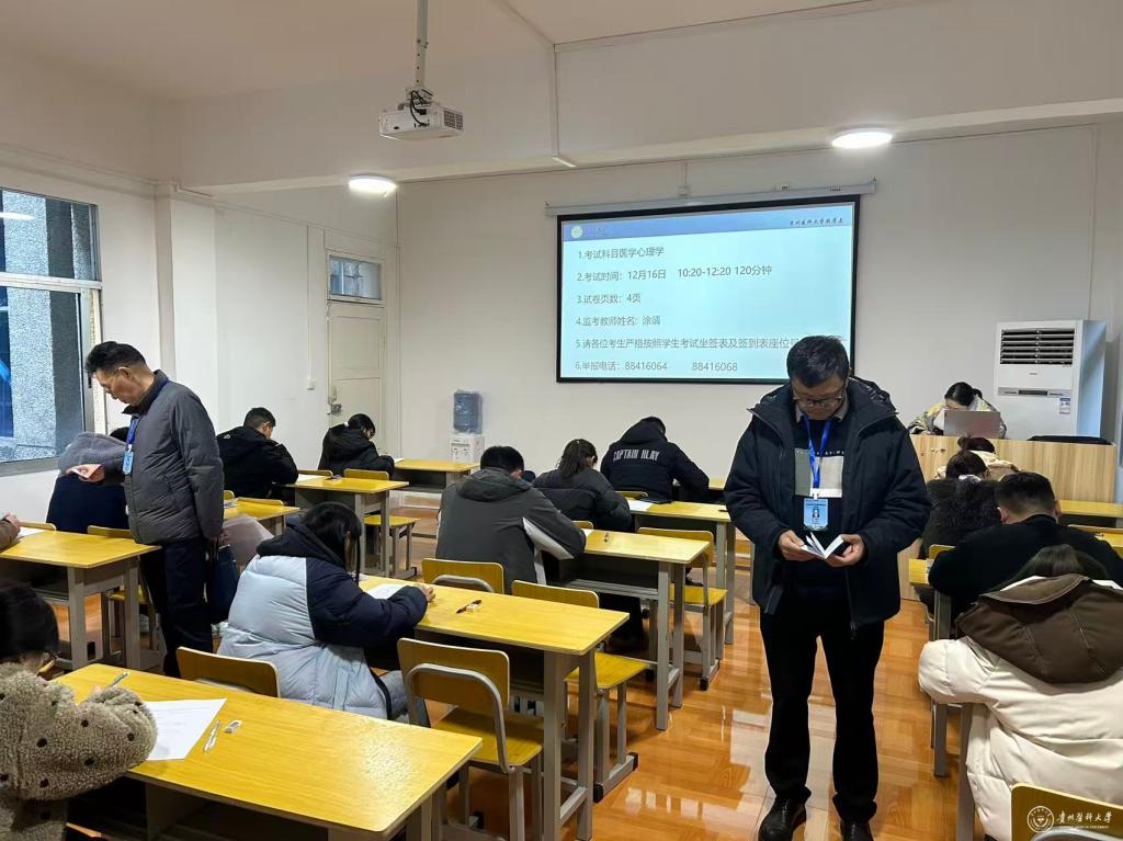 本科教学工作督导委员会委员和教学质量监控与评估办公室、教务处、医院管理处全体工作人员400余人次组成校级巡考组。其中巡考组57人次首次对本学期有教学的贵航贵阳医院(300医院)、贵航安顺医院(302医院)、第二附属医院、附属铜仁医院、第三附属医院、附属金阳医院、附属安顺中心医院、附属附属兴义医院、附属六盘水人民医院、贵州省人民医院及附属白云医院期末考试深入考场实地进行巡查。