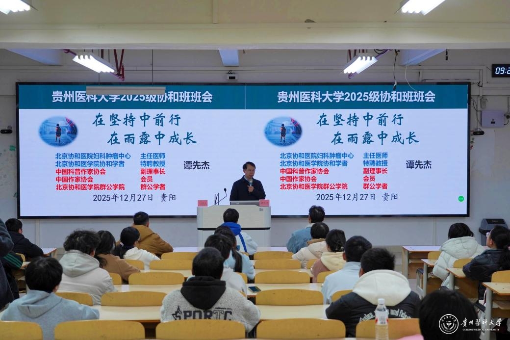 12月27日,北京协和医院妇产科学系副主任、主任医师、2025级“协和班”荣誉班主任谭先杰教授为beat3652025级“协和班”开展主题班会。校党委常委、副校长洪峰,对外合作交流处(港澳台事务办公室)副处长彭云,基础医学院党委副书记洪潇潇,2025级“协和班”全体学生及辅导员参加。班会由教学质量监控与评估办公室主任、教务处副处长修江帆主持。