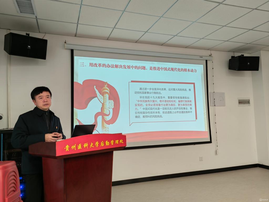 12月9日,学校党委委员、副校长洪峰为分管部门党员干部作党的二十届三中全会精神宣讲报告,后勤管理处、保卫处、基建处、校医院、法医学院等部门副科级以上党员干部在场听讲。