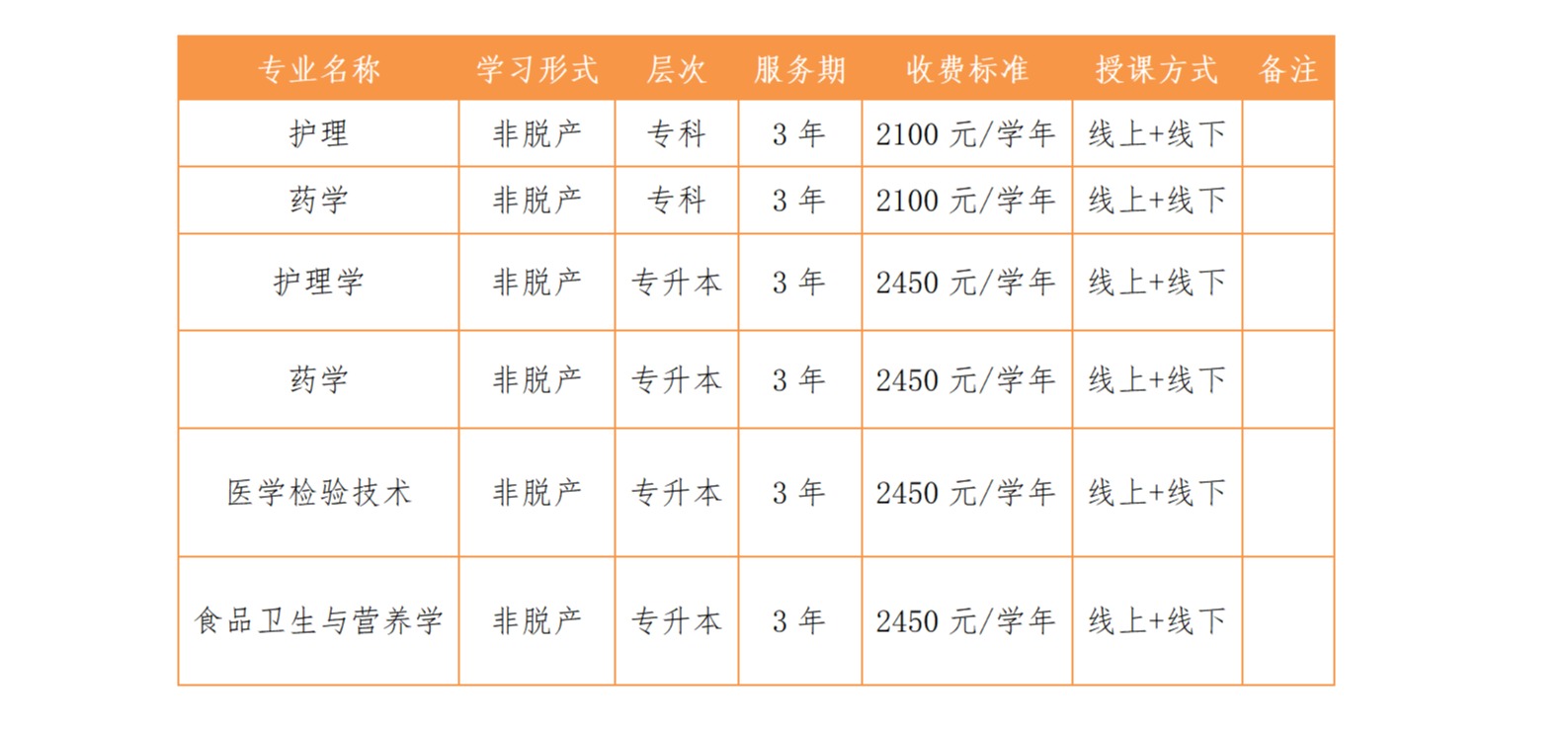 高等学历继续教育(高等教育自学考试)招收护理学、药学、食品卫生与营养学、医学检验技术4个专业。
