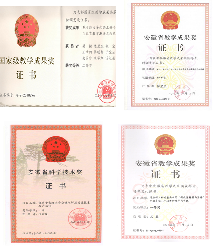 专业秉持教学科研有机融合,坚持教学-科研-应用之间的相互促进和高效衔接,建成安徽省智慧课堂课程1门,安徽省精品资源共享课程1门,省级线上线下混合式示范项目1门,逐步形成结构合理、人员稳定、教学水平高、教学效果好的教学团队,获得高等教育国家级教学成果奖二等奖1项(R2),安徽省教学成果奖特等奖4项(R1/R3/R3/R4),安徽省教学成果奖一等奖1项(R1),安徽省教学成果奖二等奖1项(R1);先后出版《纳米材料科学基础》(教育部高等学校规划教材)、《材料合成与制备技术》(高等学校十三五规划教材)等高水平教材。近三年学生在高水平创新创业竞赛中获得国家级特等奖、国家级一等奖等佳绩,以第一作者发表高水平学术论文并申请国家发明专利。